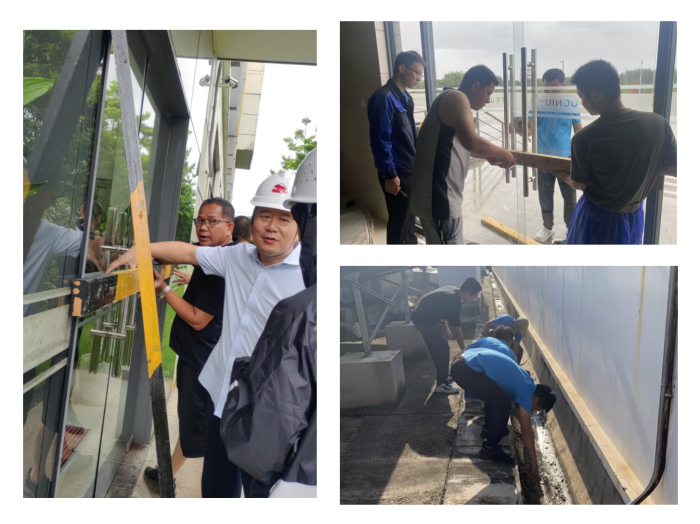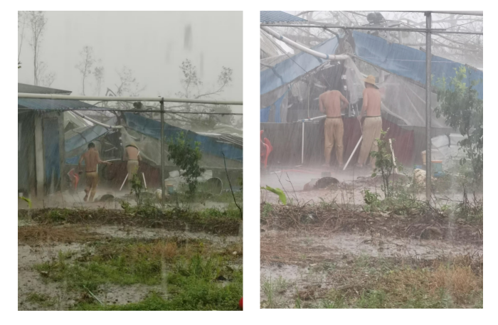 黑猪育肥部澄迈蔡氏猪场,苏文俊、汪小彪、吴芳众冒雨封堵栋舍