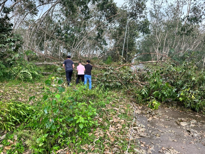 黑猪育肥部澄迈蔡氏猪场,符堆胜、吴芳众等人冒雨清理进场道路倒伏树木