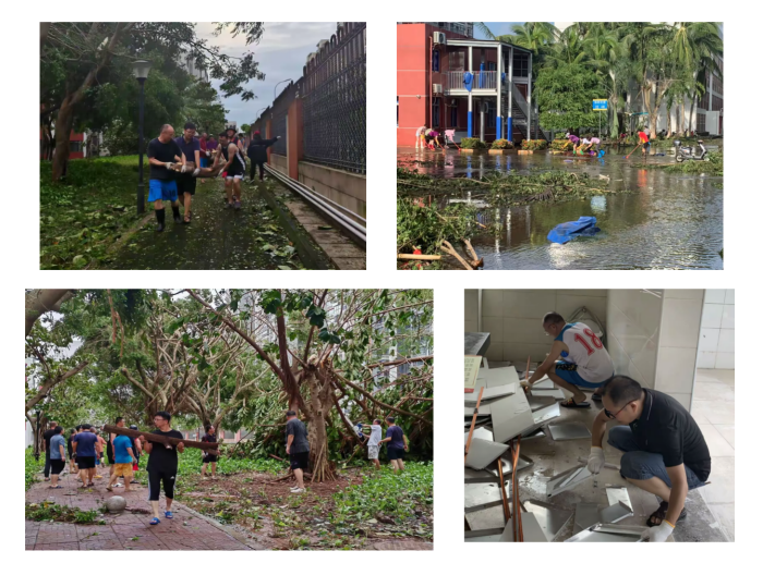 学校职员工清理校园倒伏树木、污泥积水、道路垃圾
