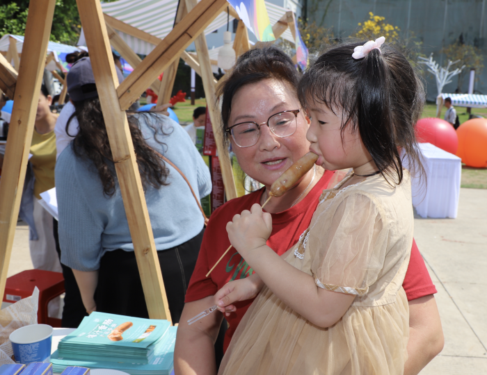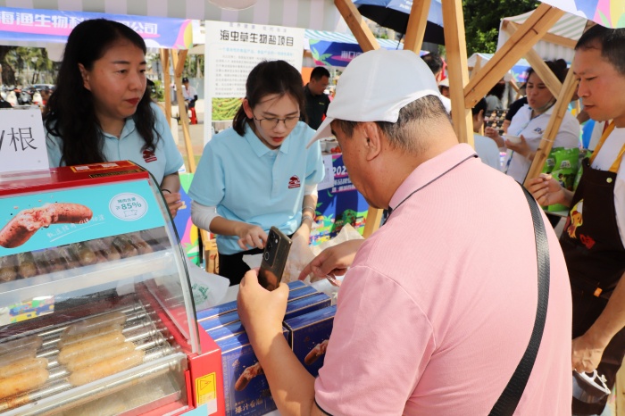 步入市集,各类摊位星罗棋布,琳琅满目的农特产品让人应接不暇。其中,罗牛山肉类有限公司的展位前人气爆棚,罗牛山的明星产品 —— 爆汁香肠在众多展品中脱颖而出,牢牢吸引住市民的目光。